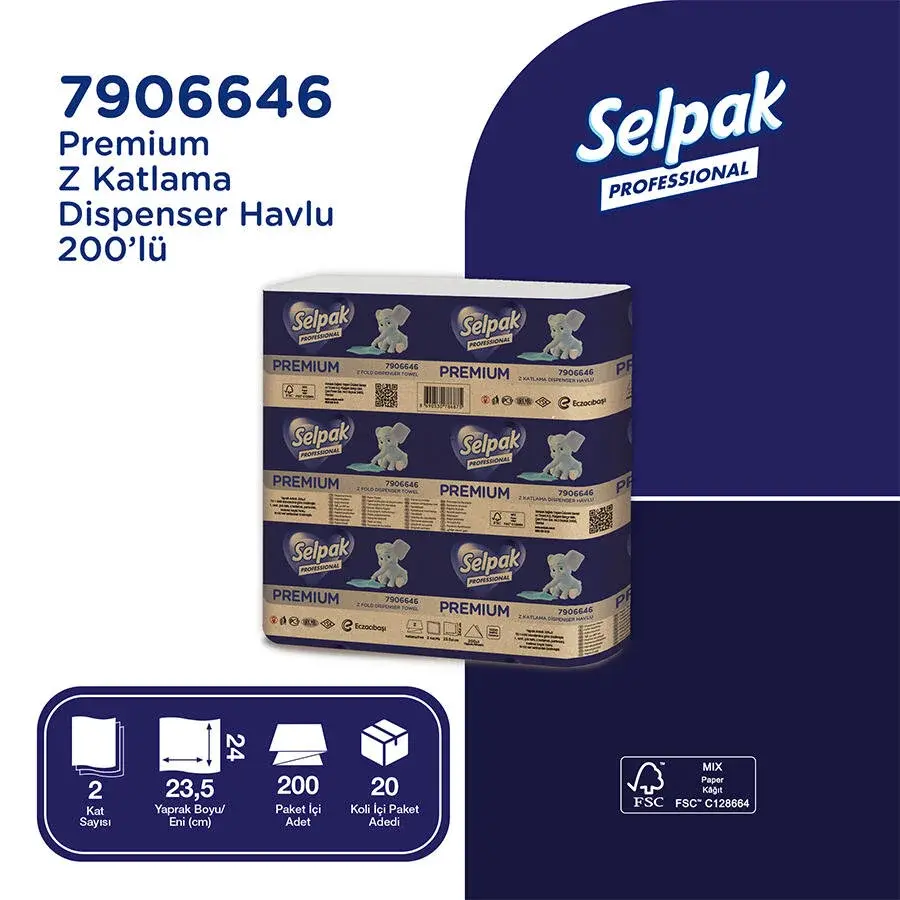 Selpak Professional Premium Z Katlama Dispenser Havlu 23,5 x 24 cm 200 Yaprak - 20'li