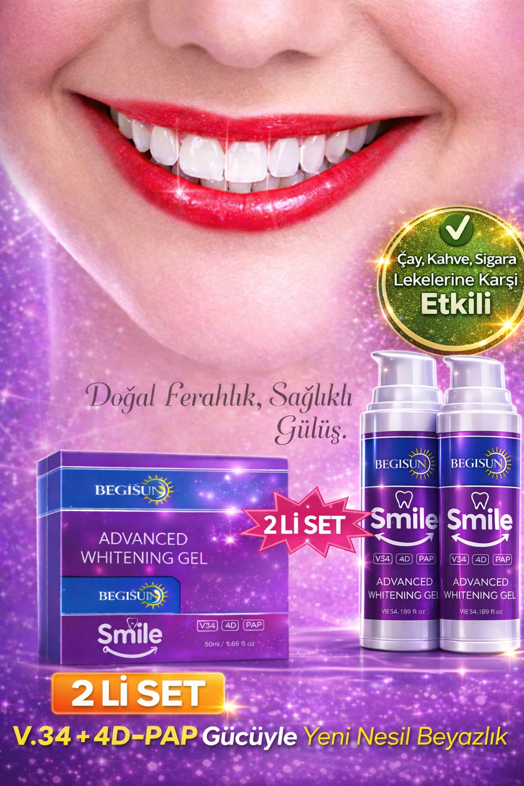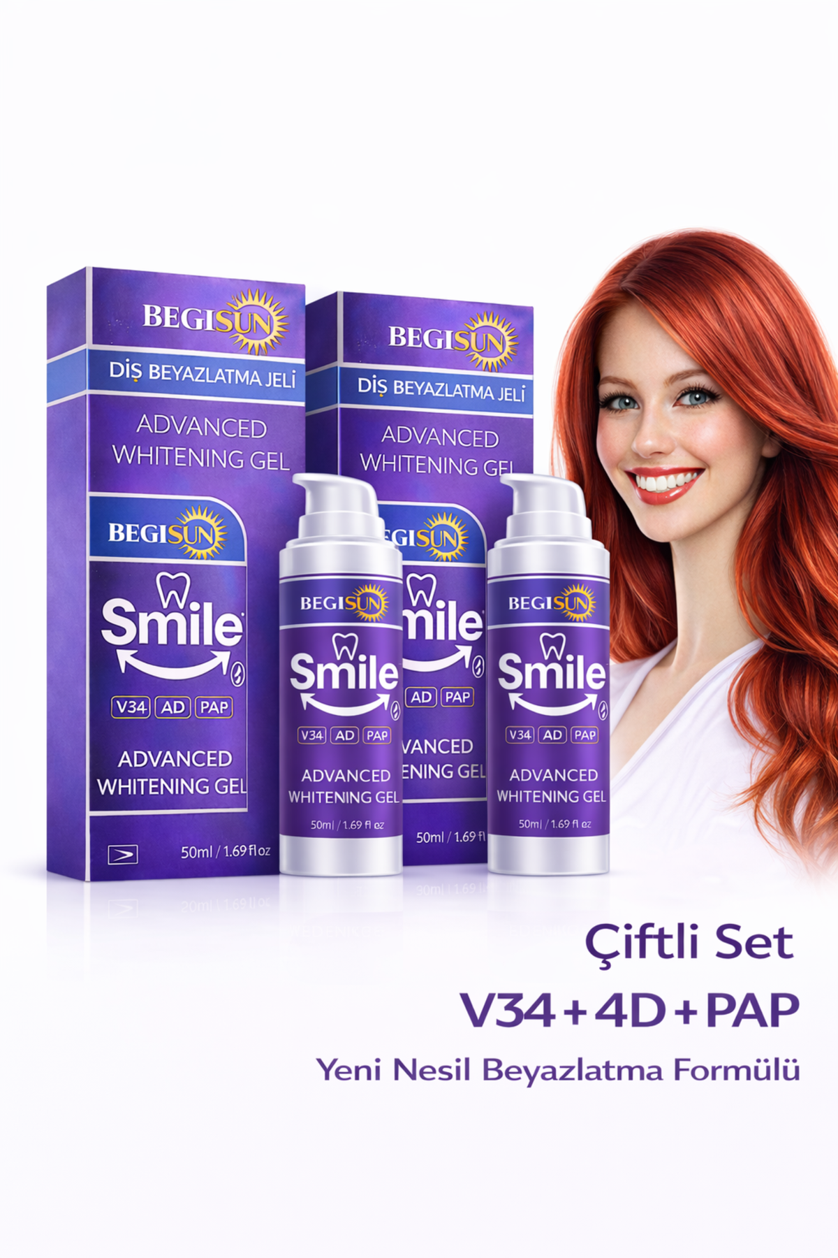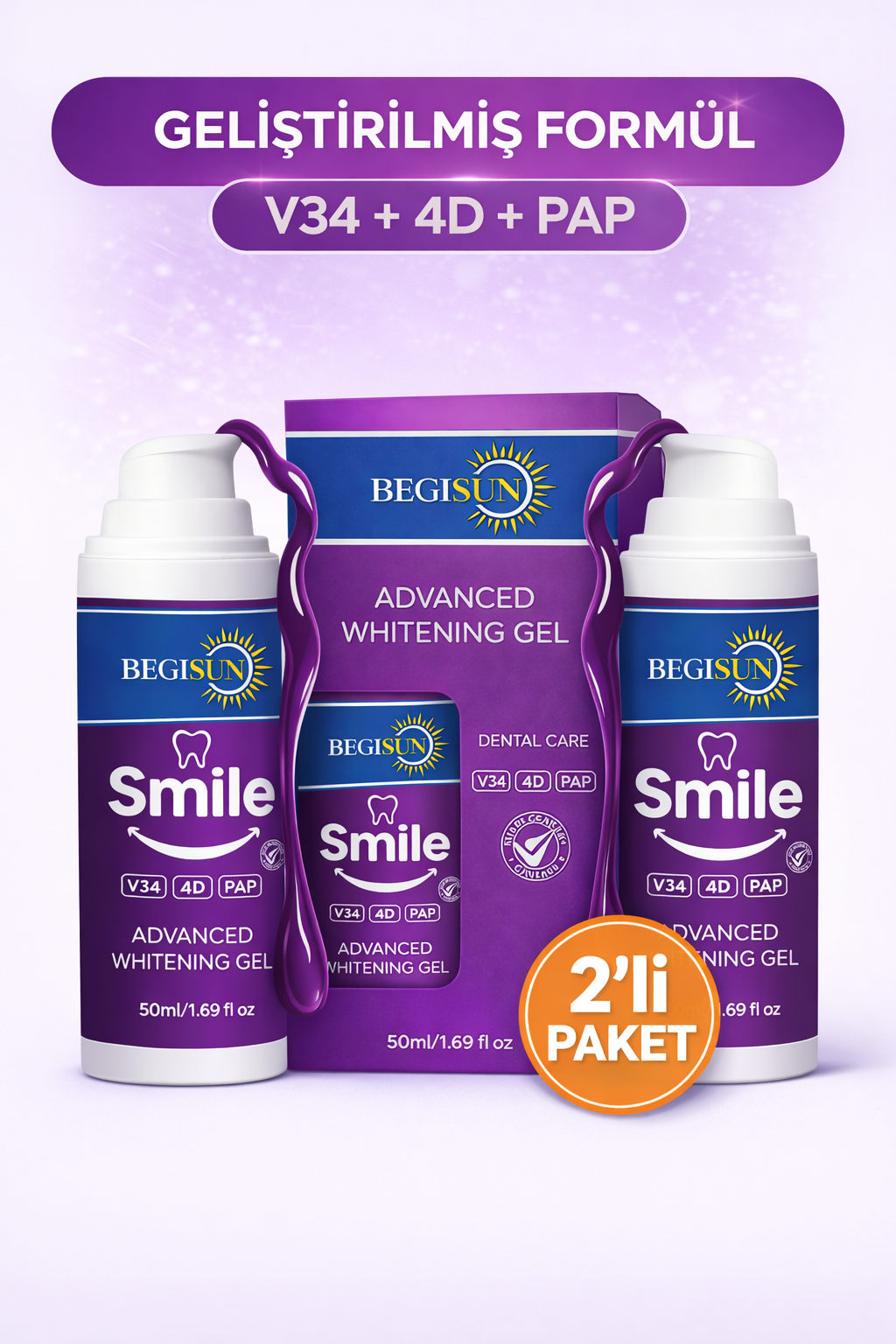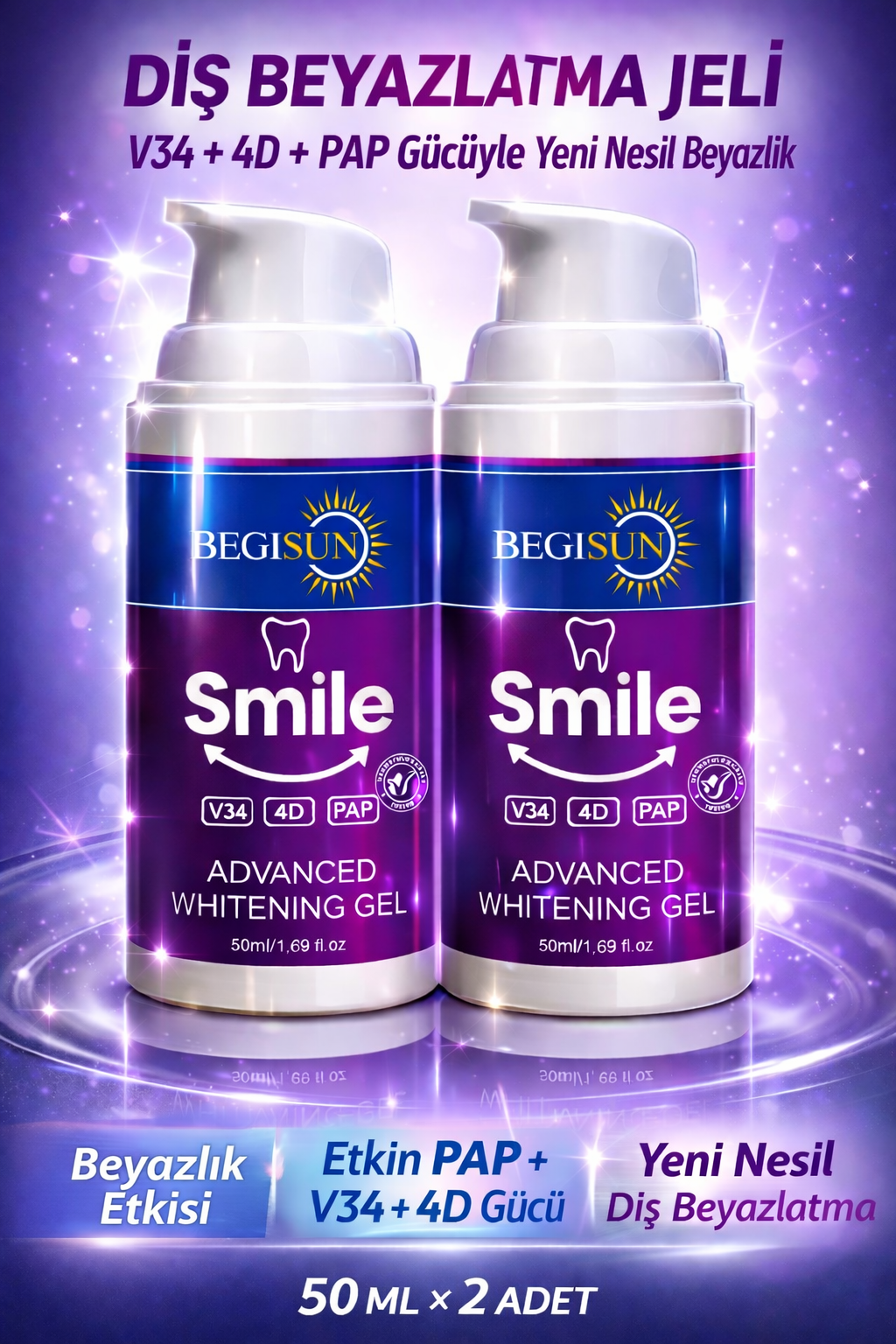 BEGISUN Diş Beyazlatma Jeli 2’li Set 50 ml x2 – V34 & 4D PAP Teknolojili, Sarı Ton Giderici